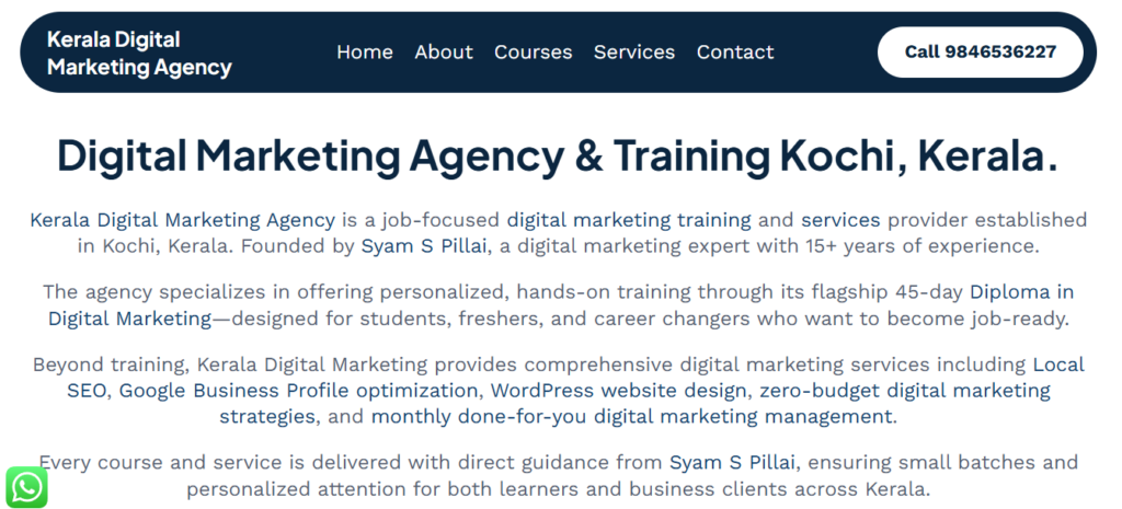 In addition to digital marketing services, Kerala Digital Marketing Agency also provides digital marketing training programs. They offer one-to-one mentoring, short courses, and a 45-day diploma program for students and professionals. These programs focus on practical learning and real industry knowledge. The training helps learners understand how digital marketing works in real business situations. Their goal is to support both businesses and individuals in achieving success in the digital world.